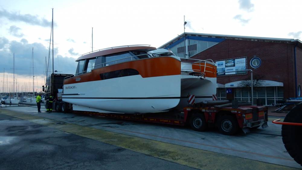 DutchCatTwelve 12,5 x 4,9 meter catamaran motorjacht van Spakenburg naar Düsseldorf Messe v.v.