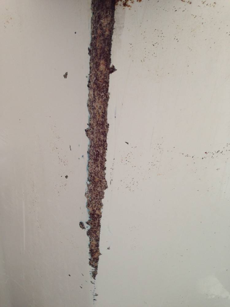 10 gelcoat reparaties van ongeveer 1 vierkante cm, en 1 lange streep van 75 cm lang en 2 cm breed op de V bodem