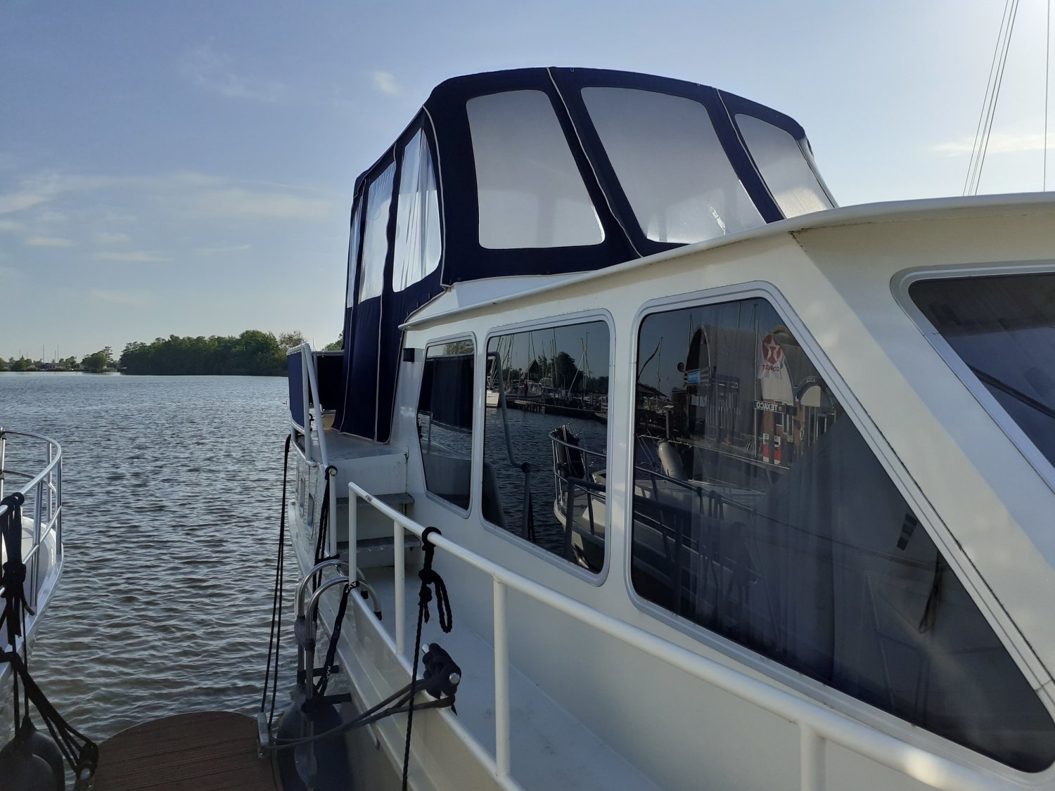 Het gaat om alles aan de buitenzijde. Romp en dek zijn behoorlijk goed. Enkele roestplekken en plekken waar de buitenste verflaag af is. Gangboord moet met antislipverf. Onderwaterschip is minder goed en moet voledig geschuurd worden.